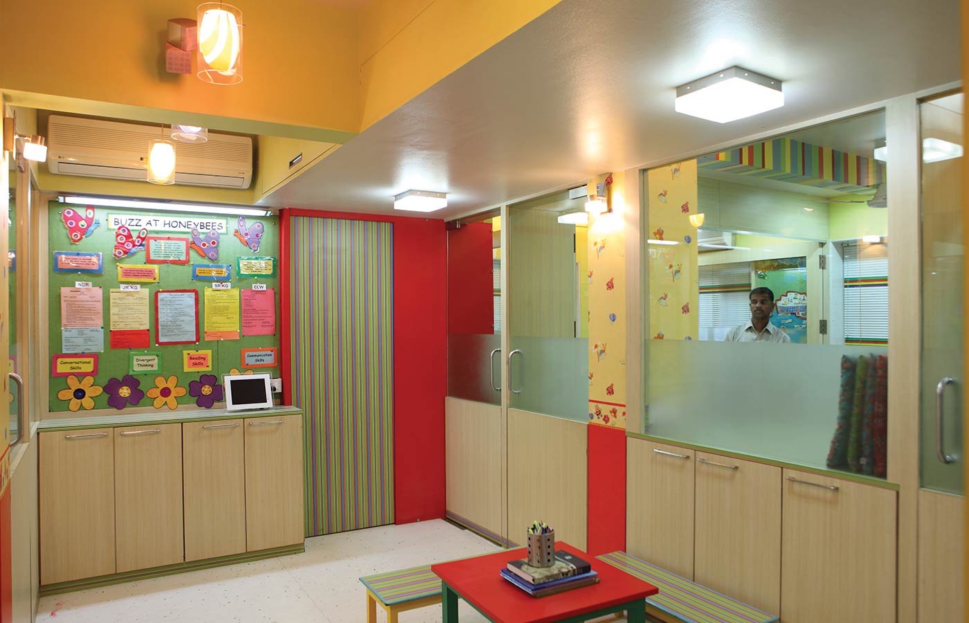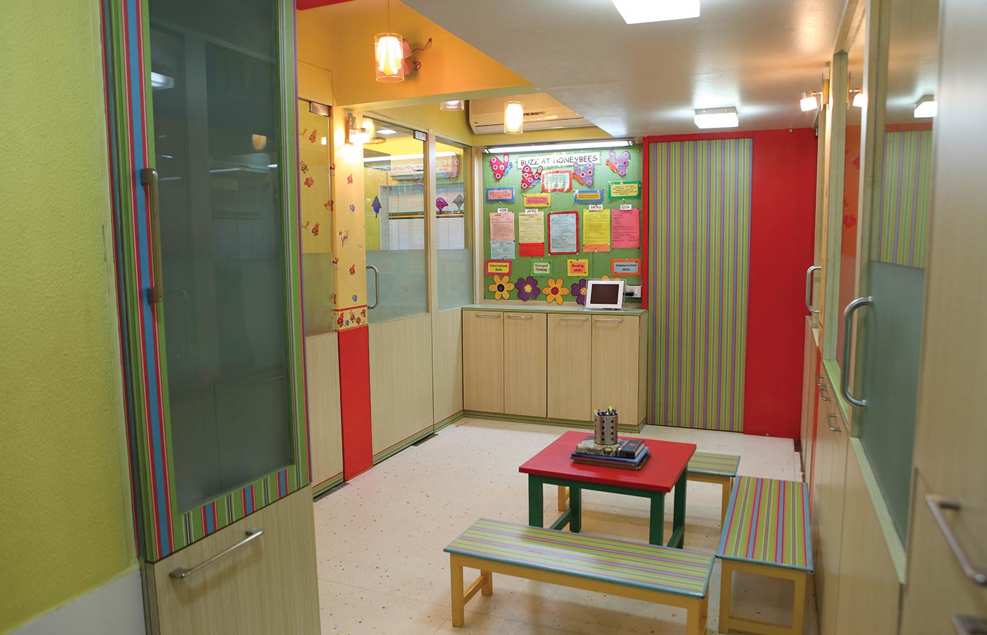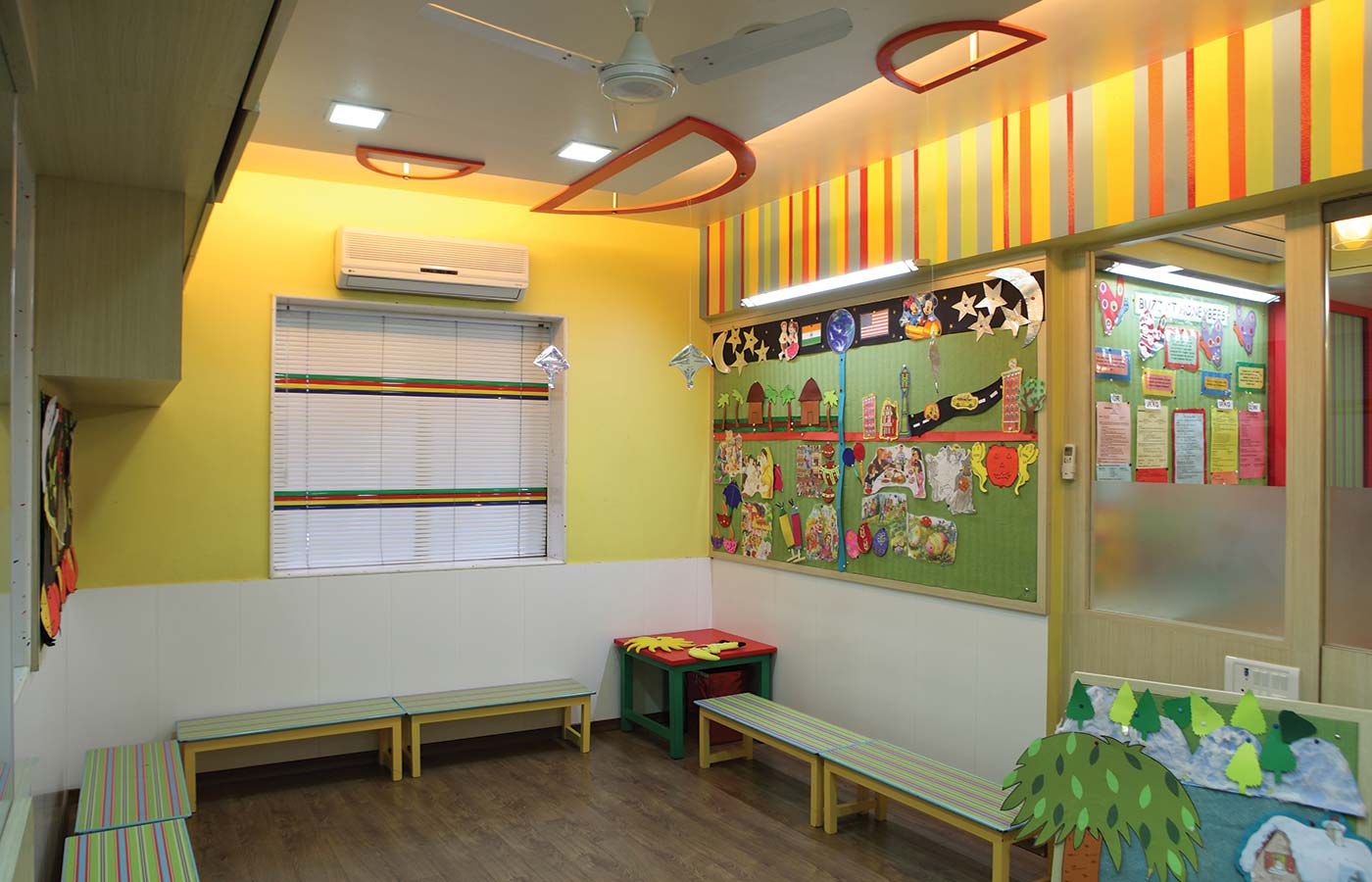 Dash of colours, themed soft boards with tree elements, specially designed curtain blinds topped off with caricatures on the wall, all enhancing the experience of the kids serving a perfect backdrop to this temple of education for the tiny tots who come here on a daily basis for their learning mixed with a lot of fun.Mrs. Shah had a fresh concept of teaching language to young minds. Armed with experience of rip-roaring sessions with kids we set about designing a classroom, which provided a conducive environment for learning.