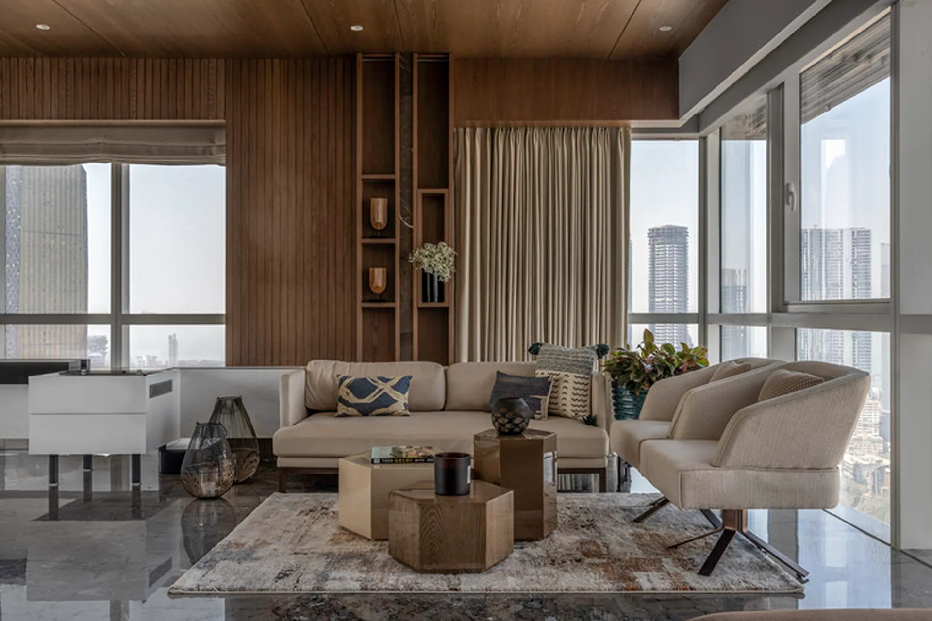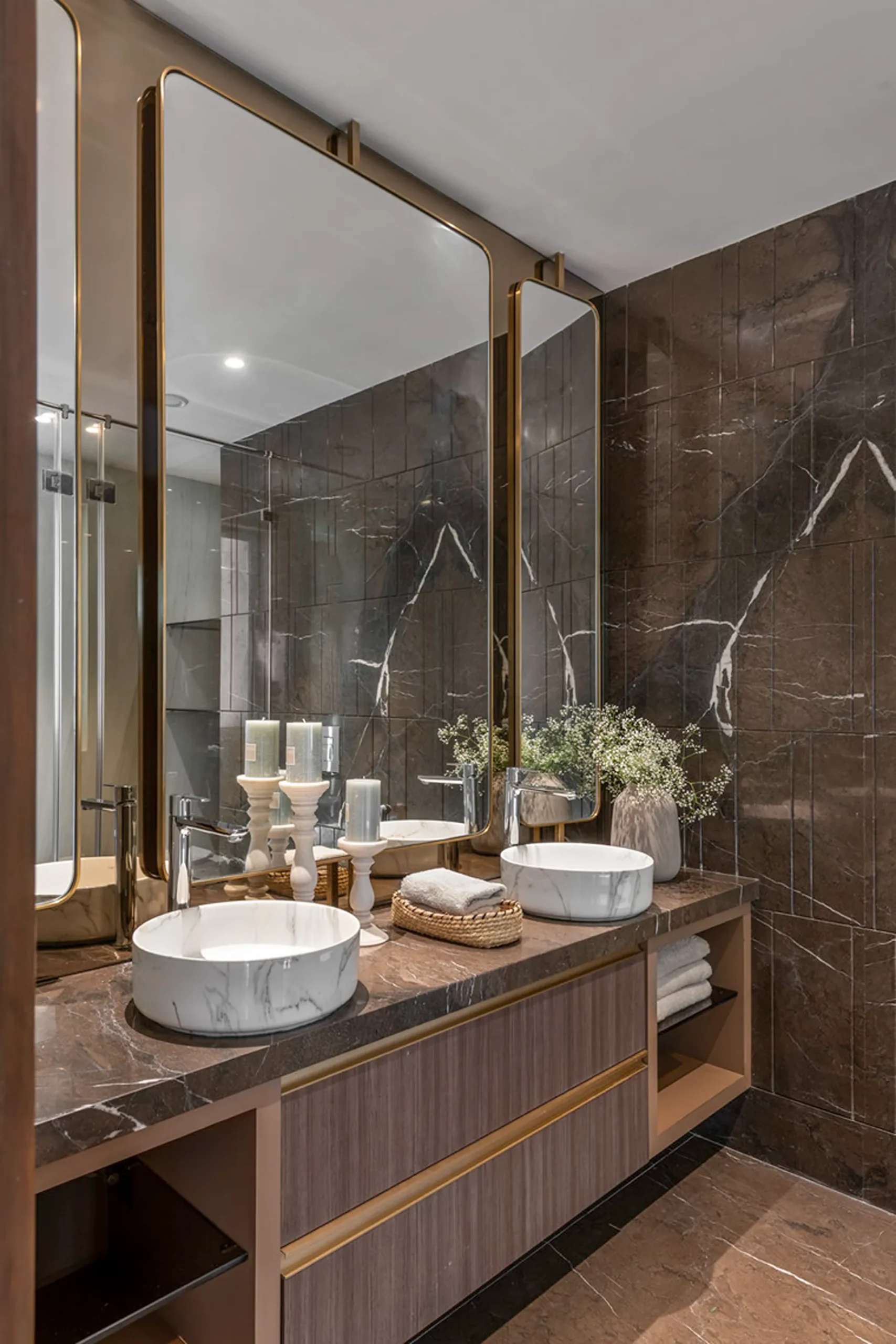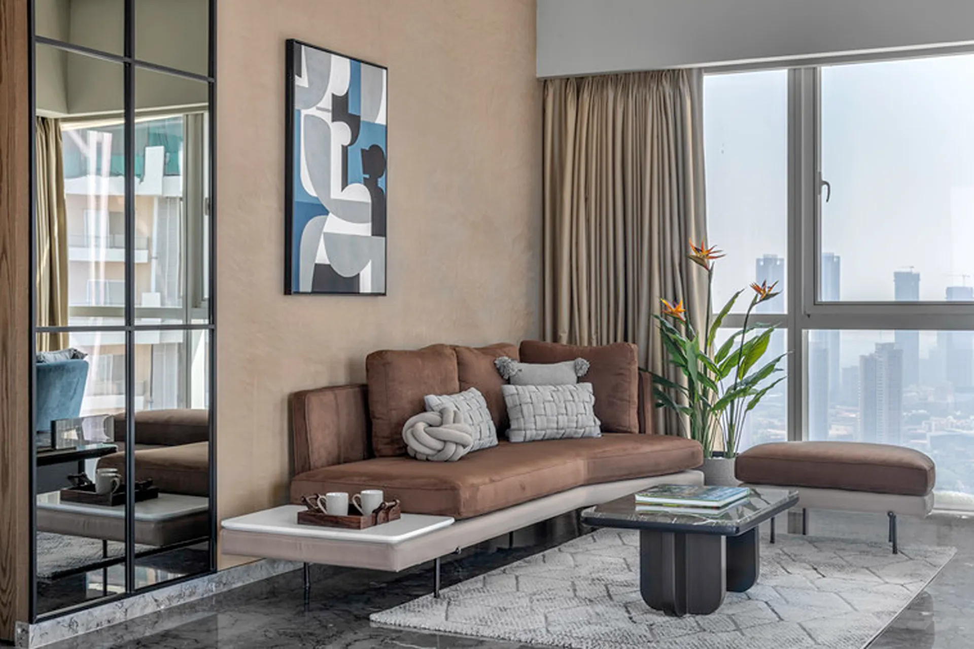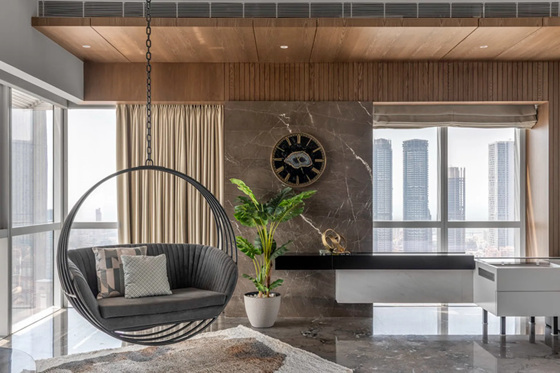 Thoughtful zoning plays a key role in amplifying the expanse, allowing seamless transitions between public and private areas while enhancing the sense of volume and flow. Full-height glass façades wrap around the home, inviting in abundant natural light and framing panoramic views that change with the time of day. A seamless blend of rich marble and warm veneer flooring provides a fluid foundation, while neutral earthen tones offer understated warmth.