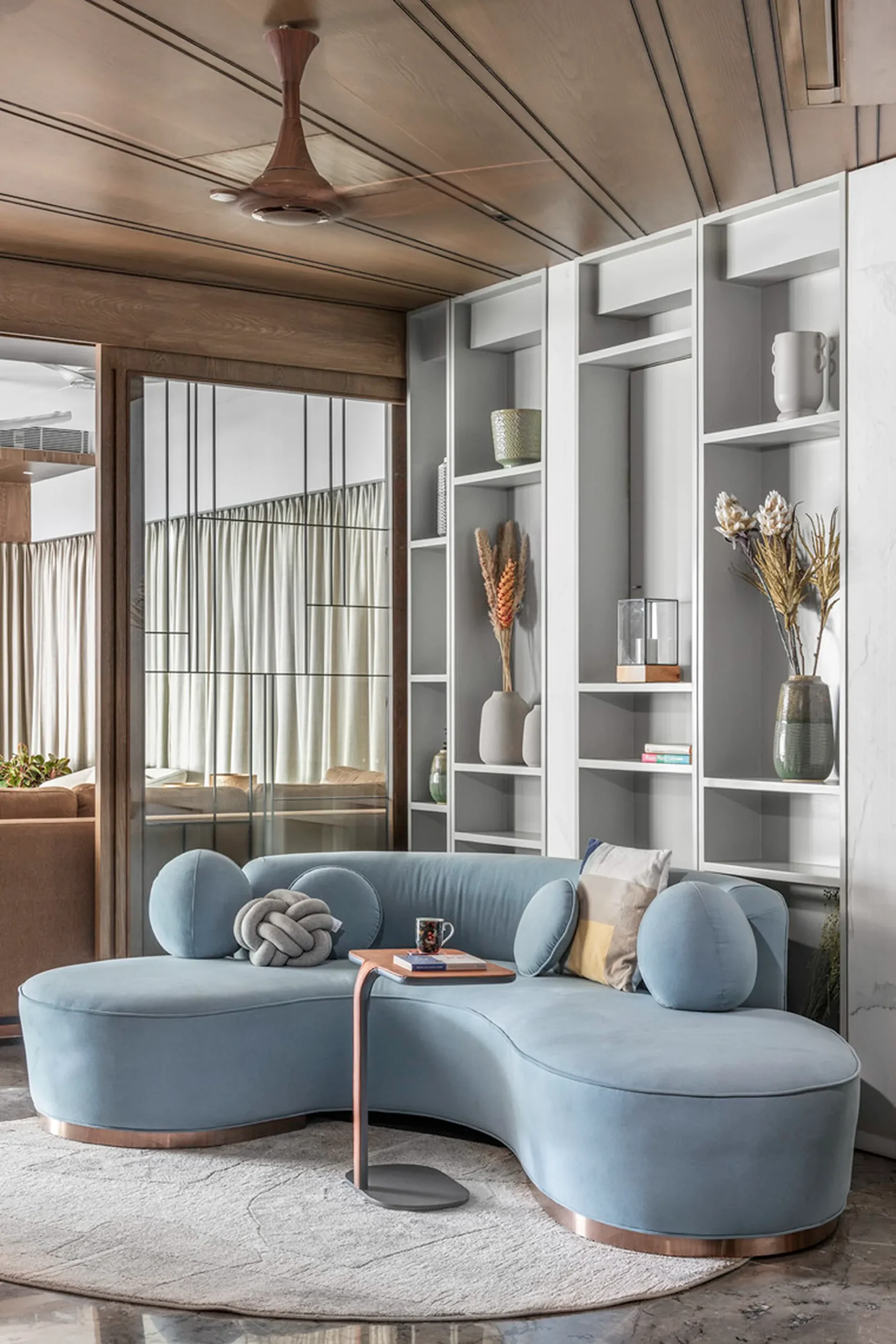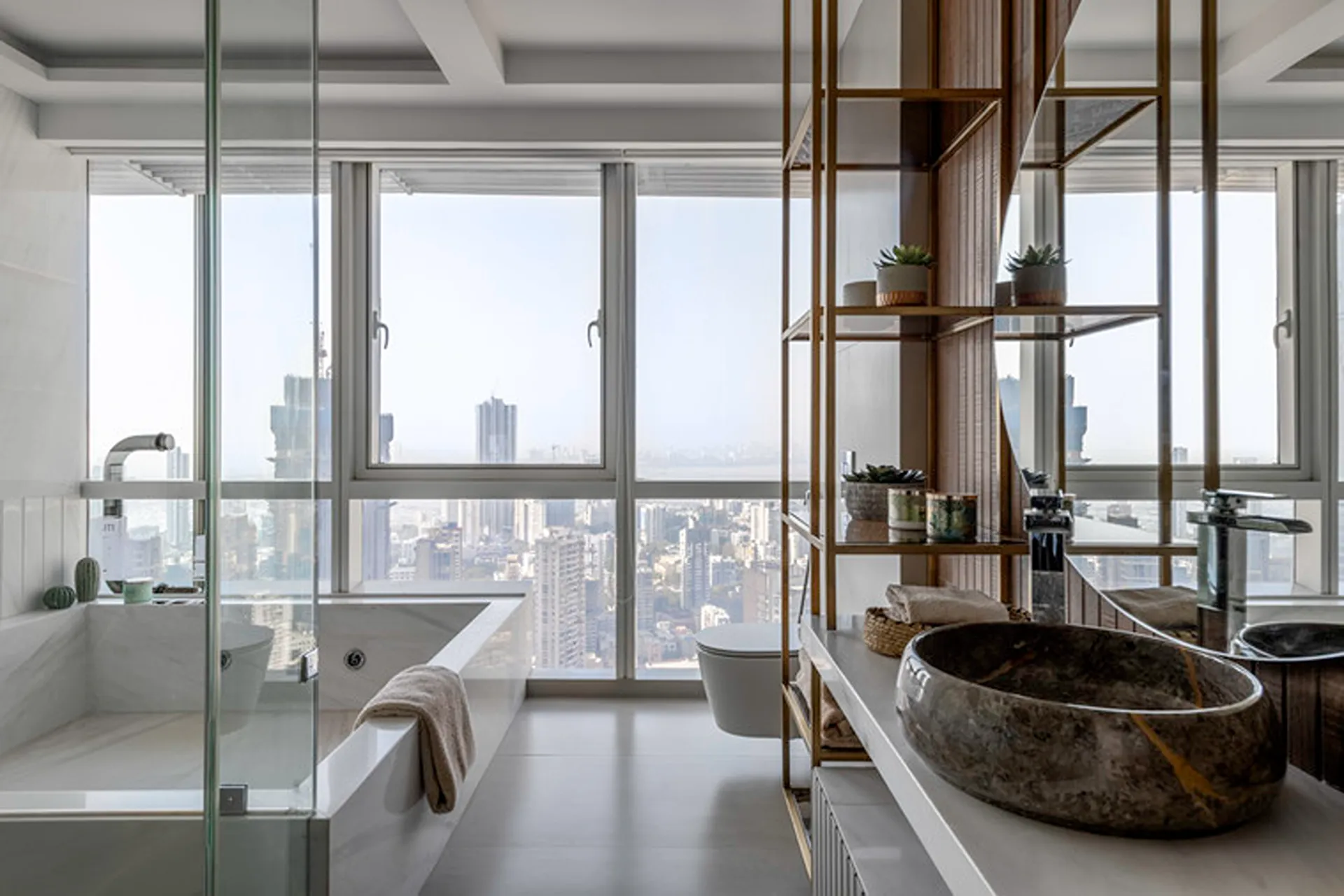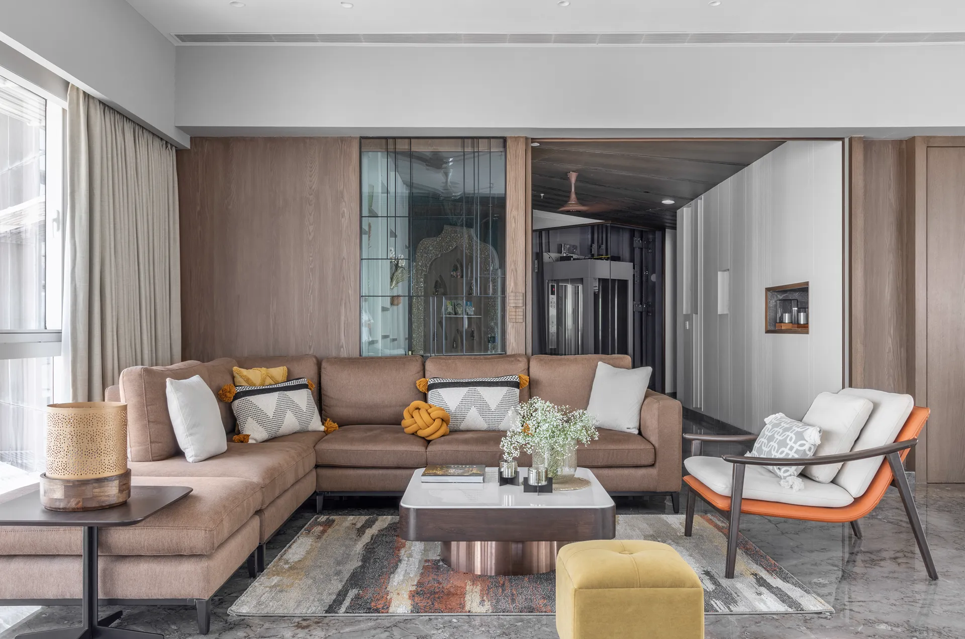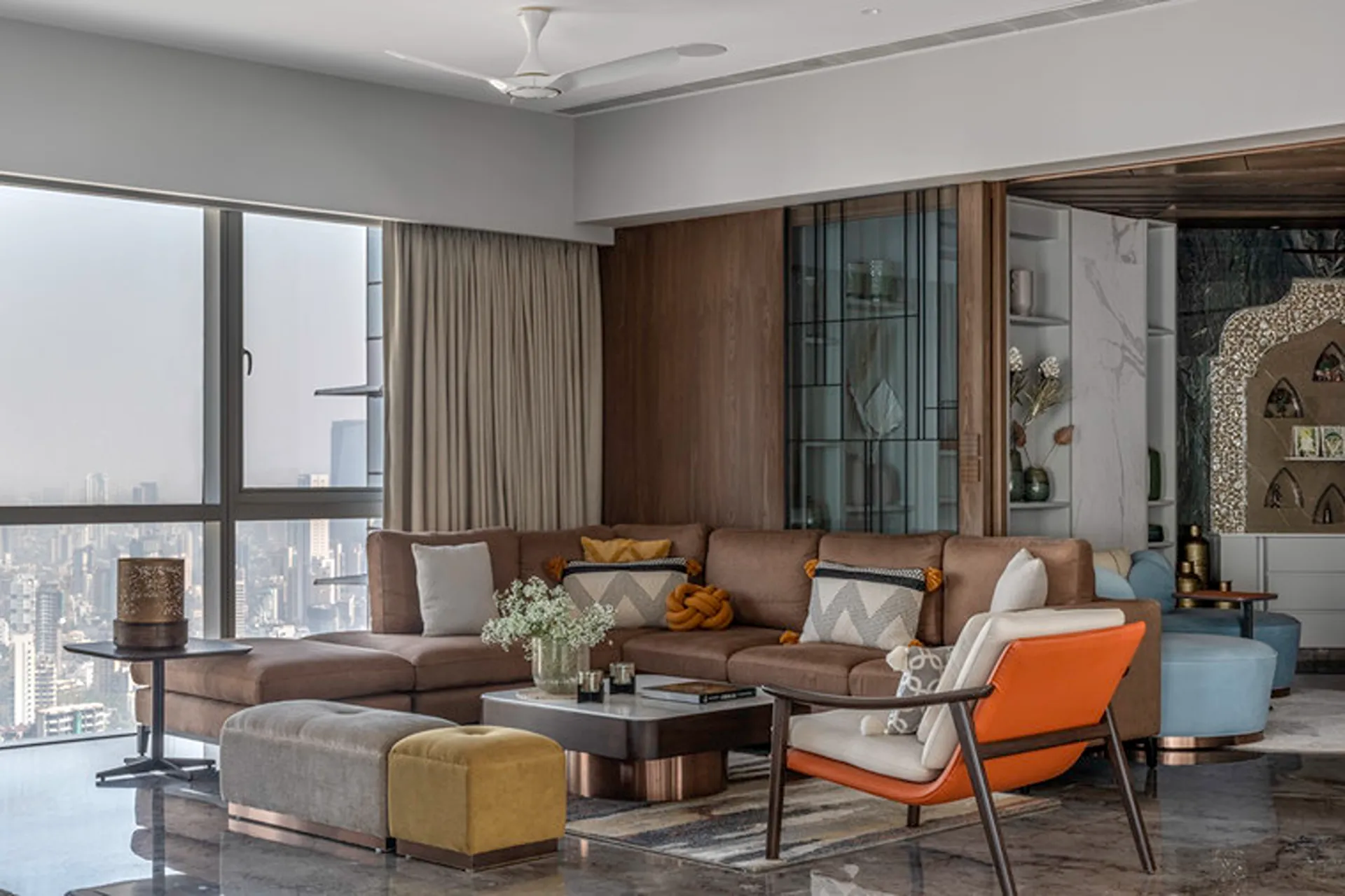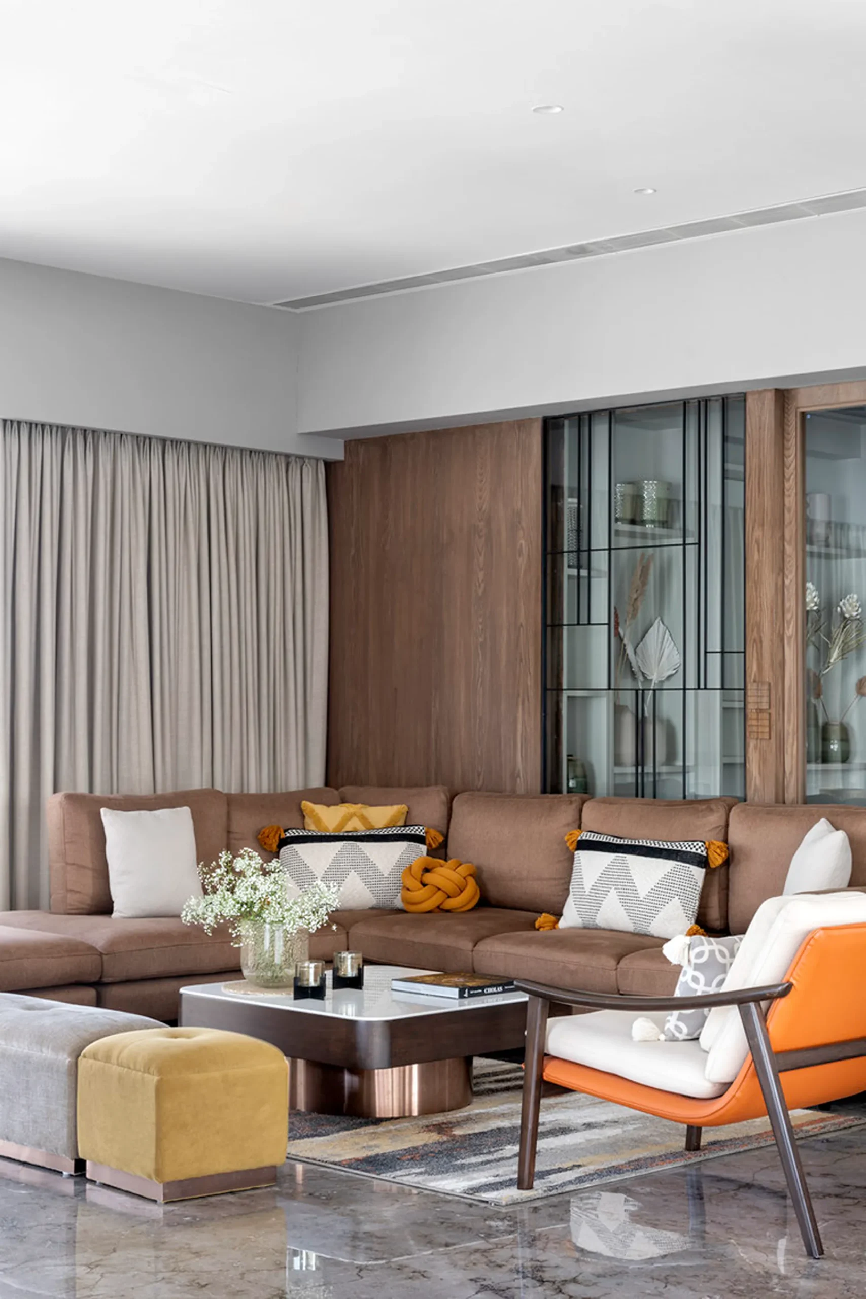 Thoughtful zoning plays a key role in amplifying the expanse, allowing seamless transitions between public and private areas while enhancing the sense of volume and flow. Full-height glass façades wrap around the home, inviting in abundant natural light and framing panoramic views that change with the time of day. A seamless blend of rich marble and warm veneer flooring provides a fluid foundation, while neutral earthen tones offer understated warmth.