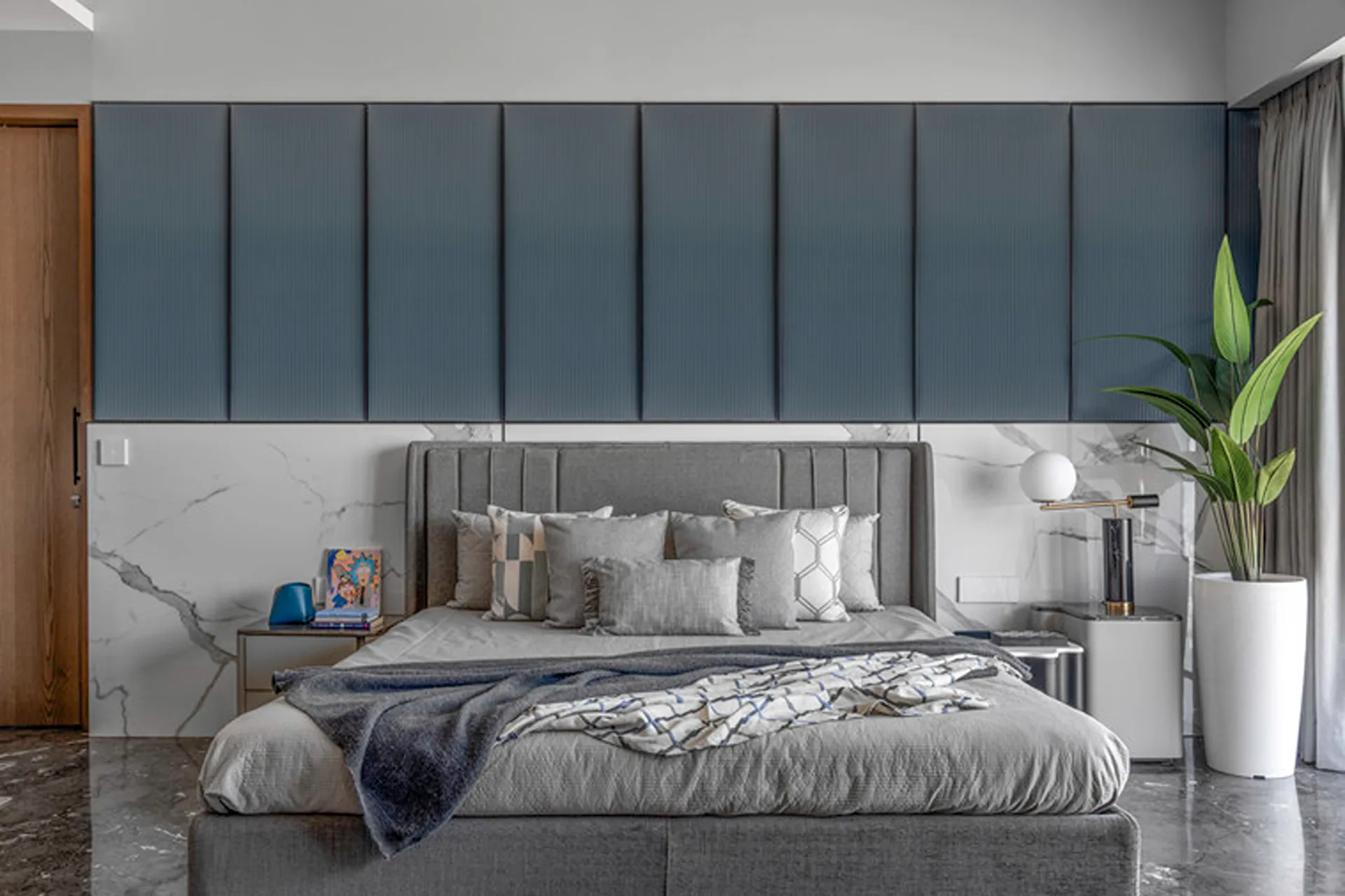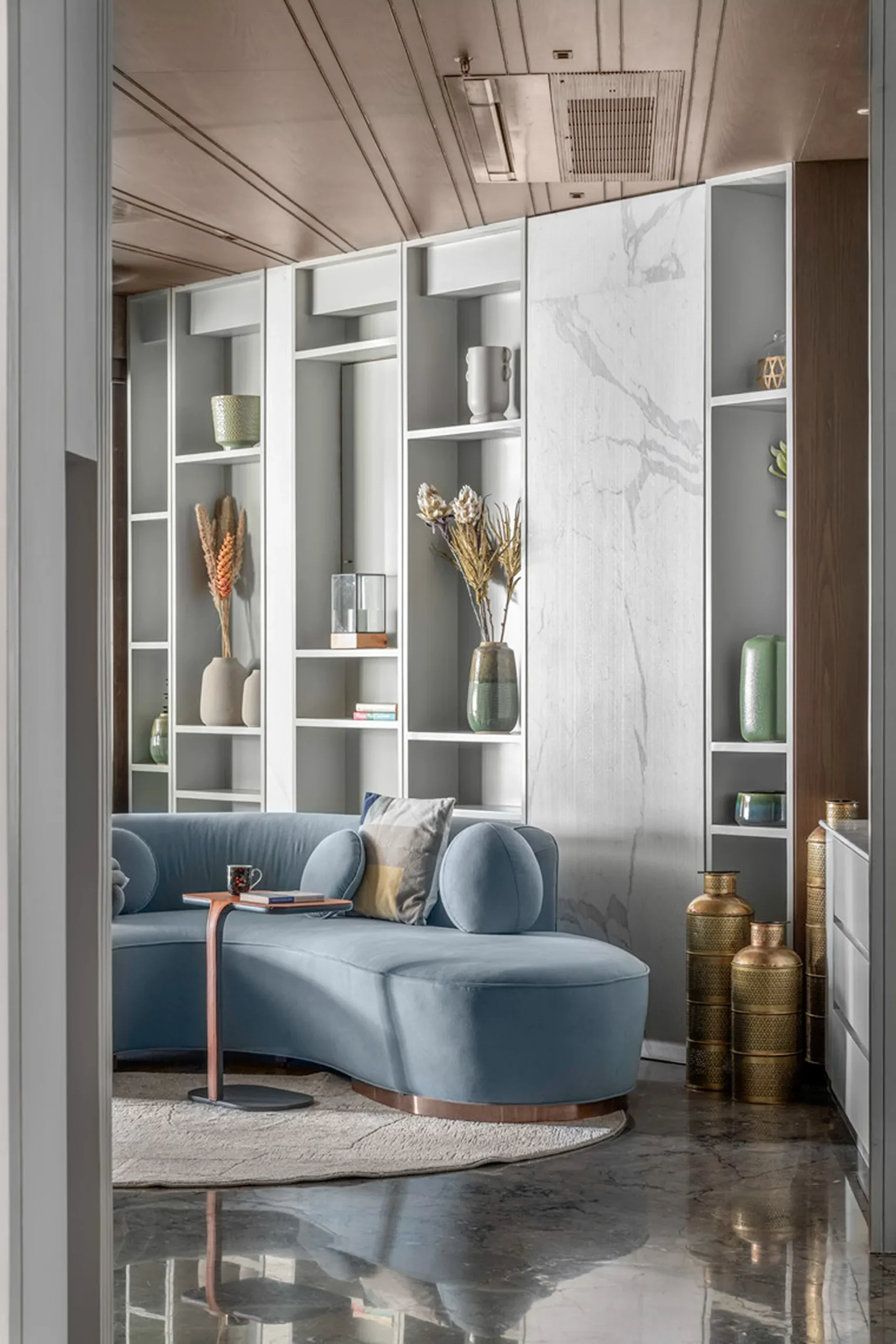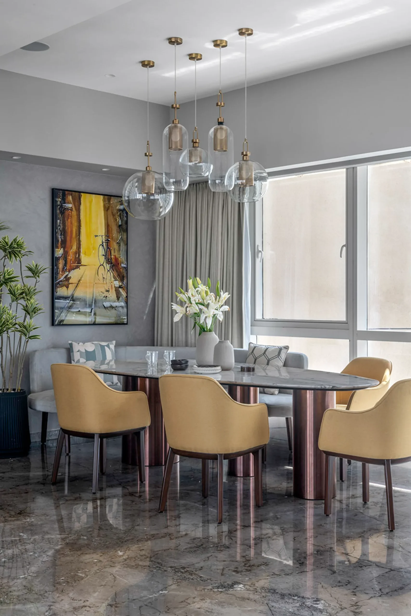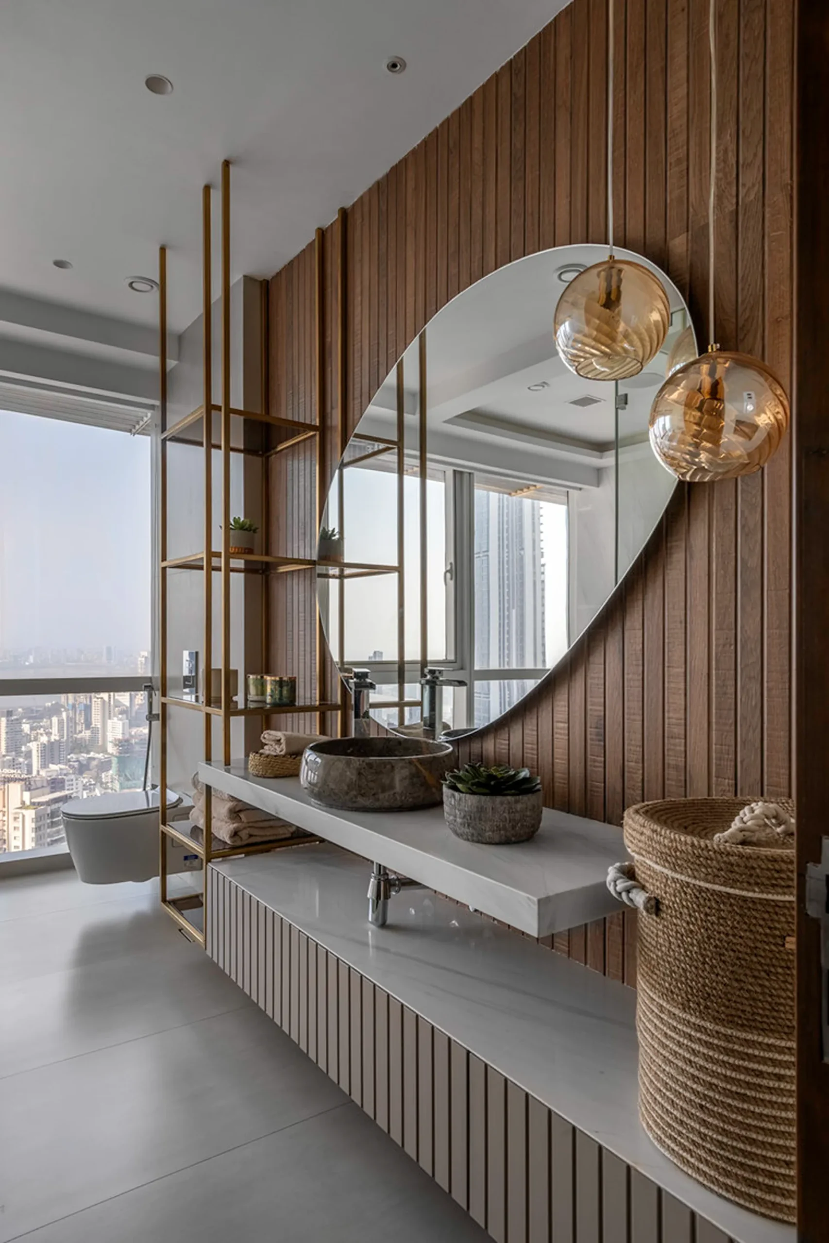 Thoughtful zoning plays a key role in amplifying the expanse, allowing seamless transitions between public and private areas while enhancing the sense of volume and flow. Full-height glass façades wrap around the home, inviting in abundant natural light and framing panoramic views that change with the time of day. A seamless blend of rich marble and warm veneer flooring provides a fluid foundation, while neutral earthen tones offer understated warmth.