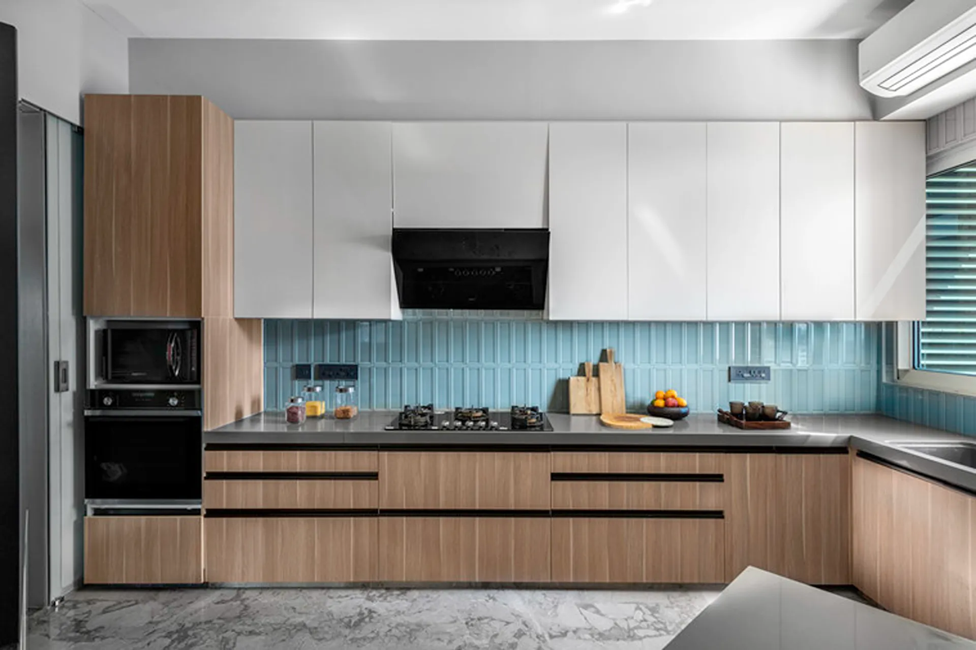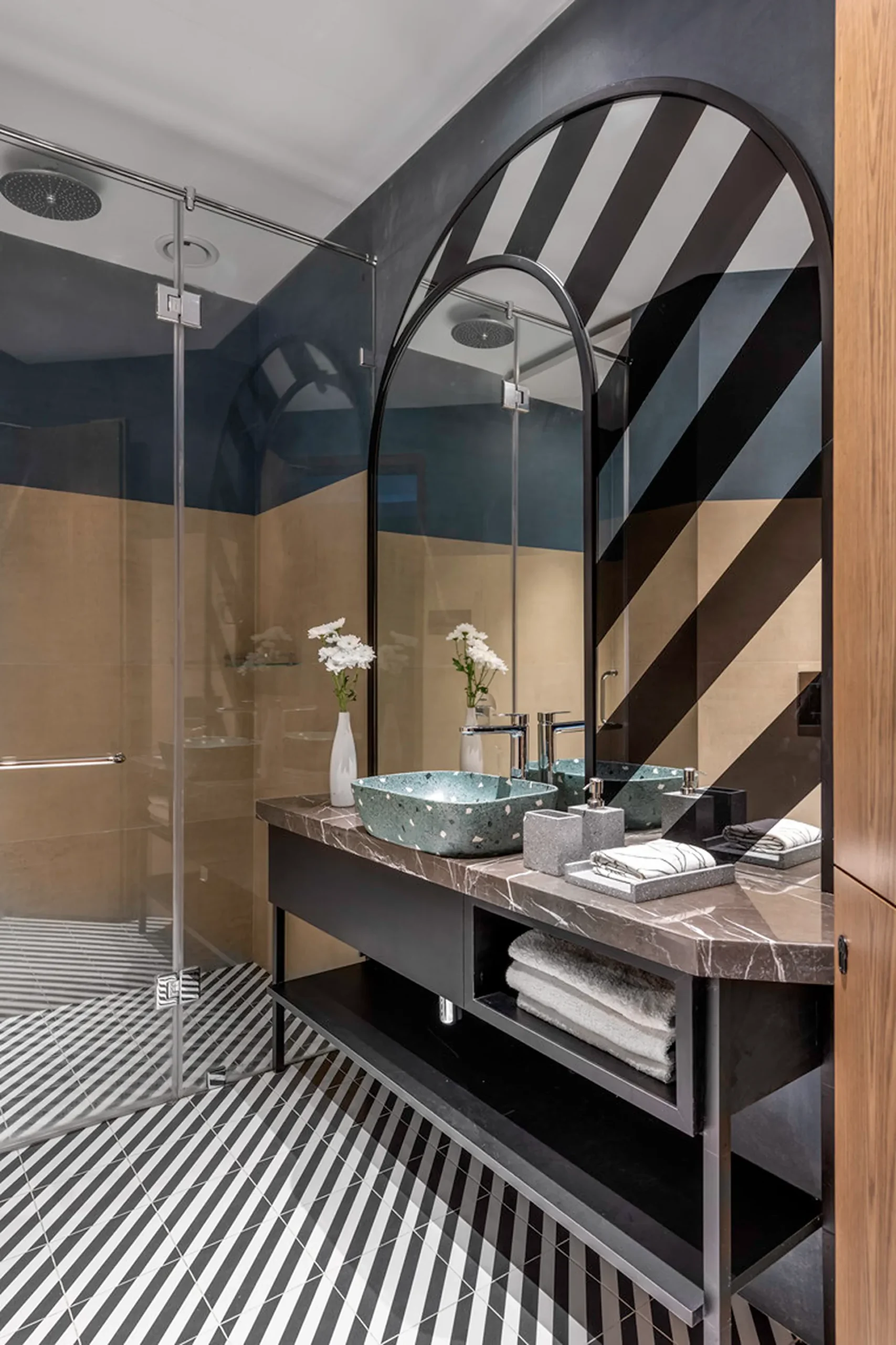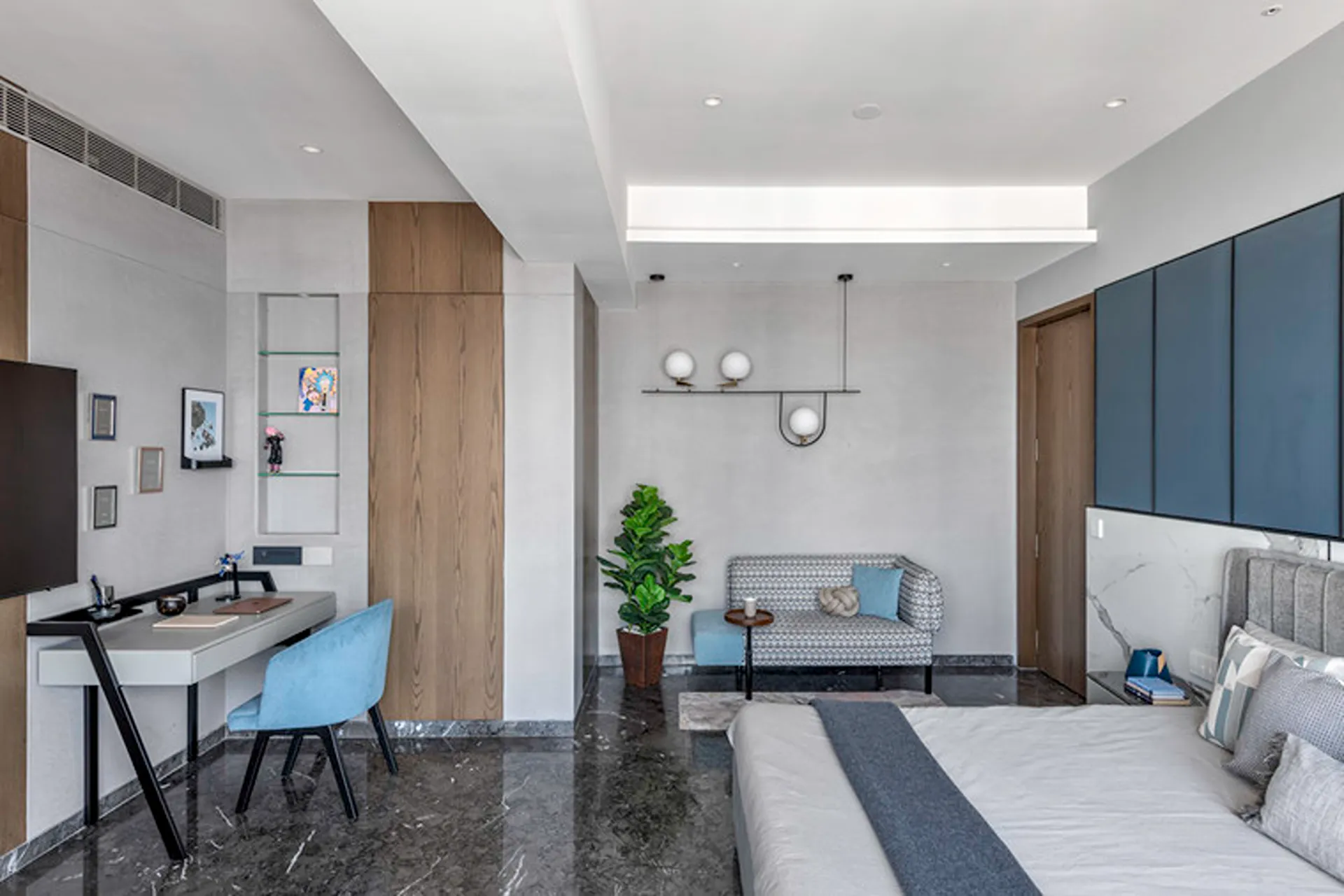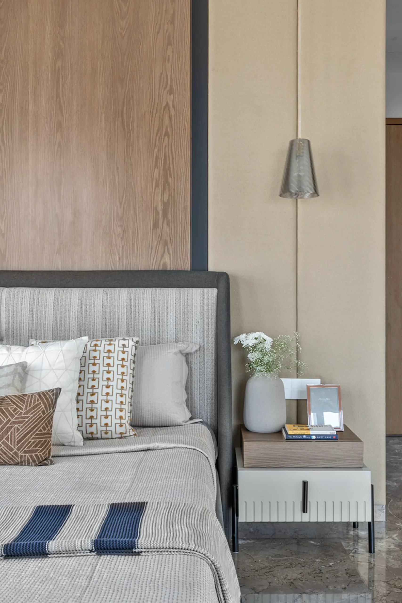 Thoughtful zoning plays a key role in amplifying the expanse, allowing seamless transitions between public and private areas while enhancing the sense of volume and flow. Full-height glass façades wrap around the home, inviting in abundant natural light and framing panoramic views that change with the time of day. A seamless blend of rich marble and warm veneer flooring provides a fluid foundation, while neutral earthen tones offer understated warmth.