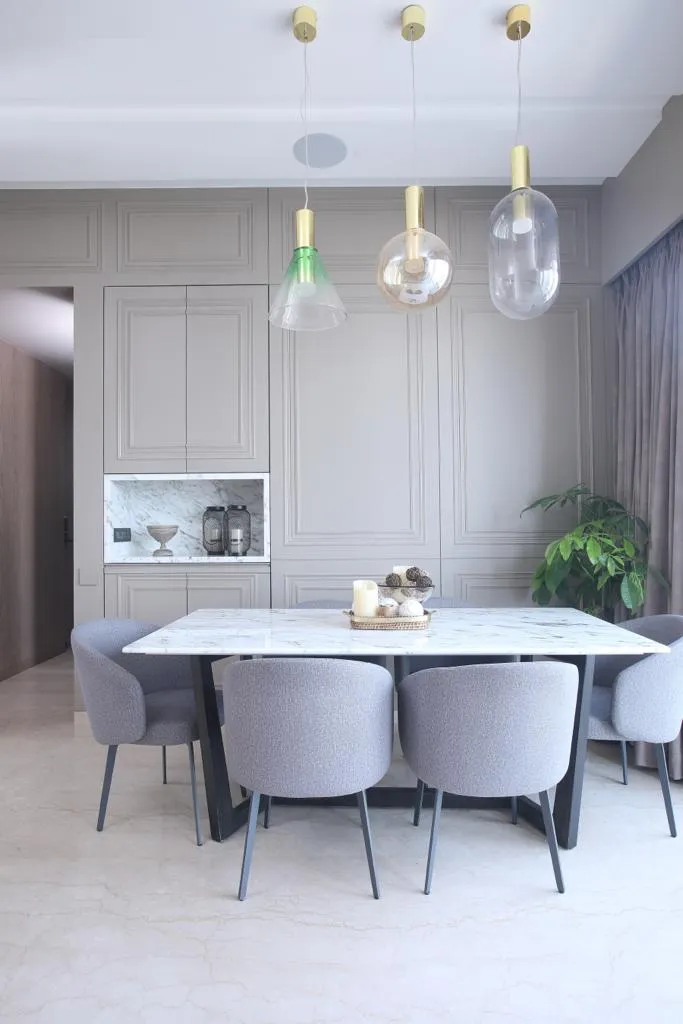 Inspired by Art Deco and fused with contemporary design, the home reflects a marriage of geometry, materials, and colors. The location itself guided the narrative, with indoor-outdoor connections through the deck creating a sense of openness reminiscent of Manhattan’s cool grandeur. Tropical-print cushions from Jim Thompson Fabrics, candle clusters from Good Earth, and furnishings by Sarita Handa introduce natural warmth and break the monotony of solid surfaces.