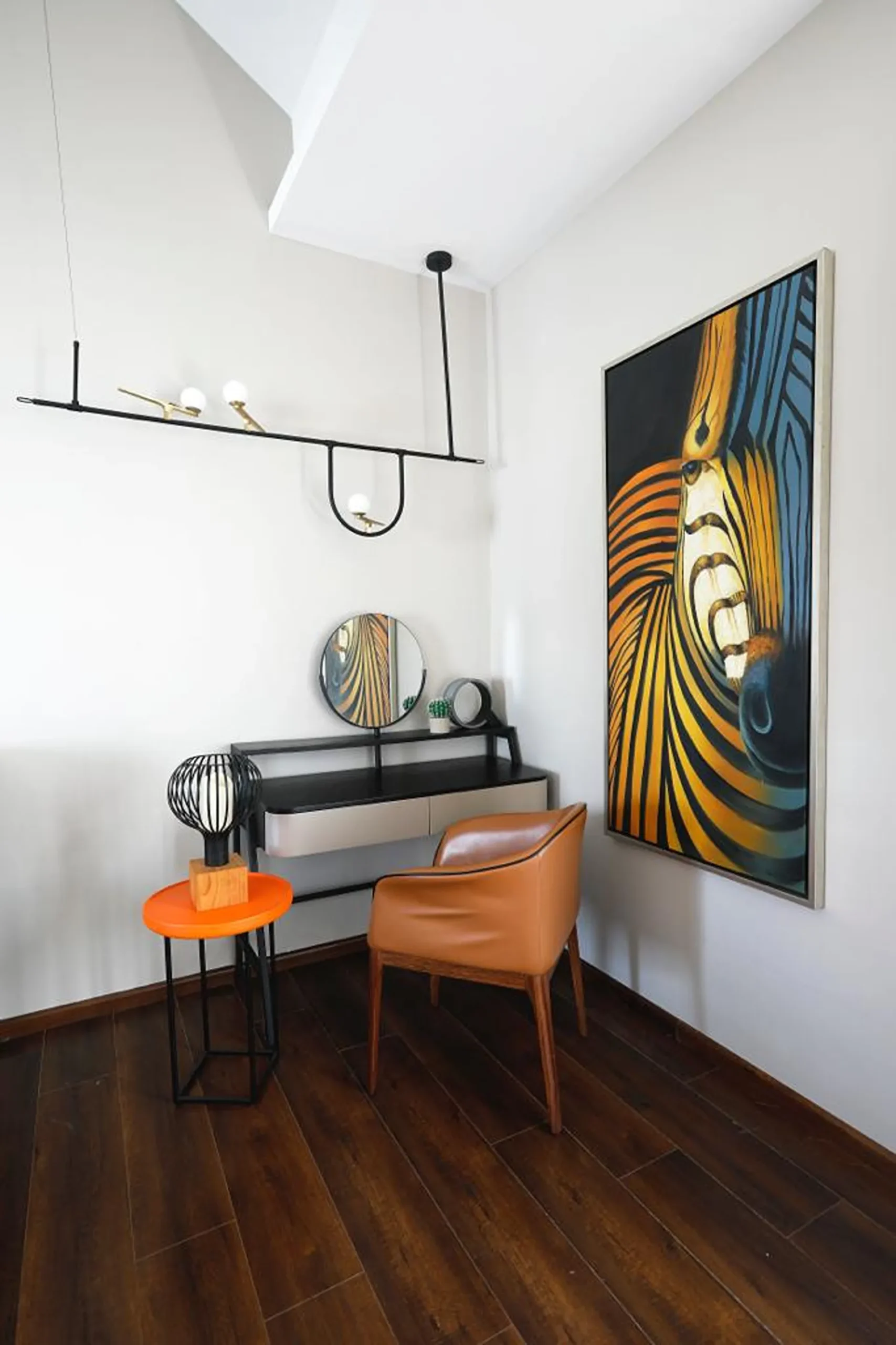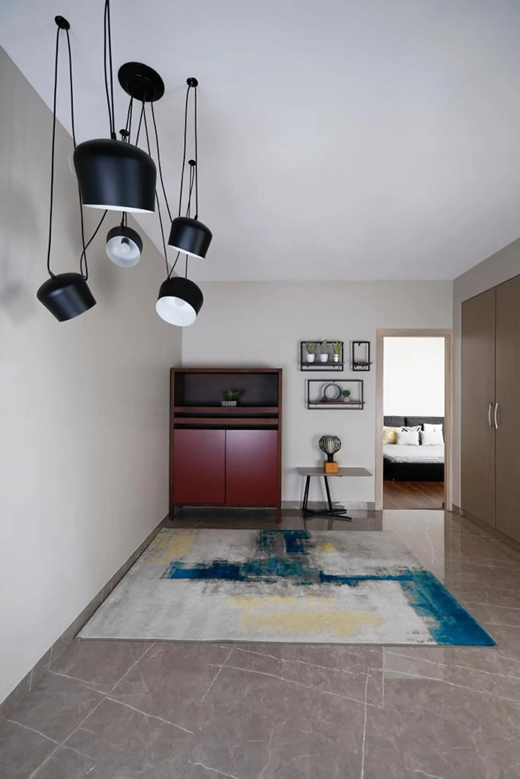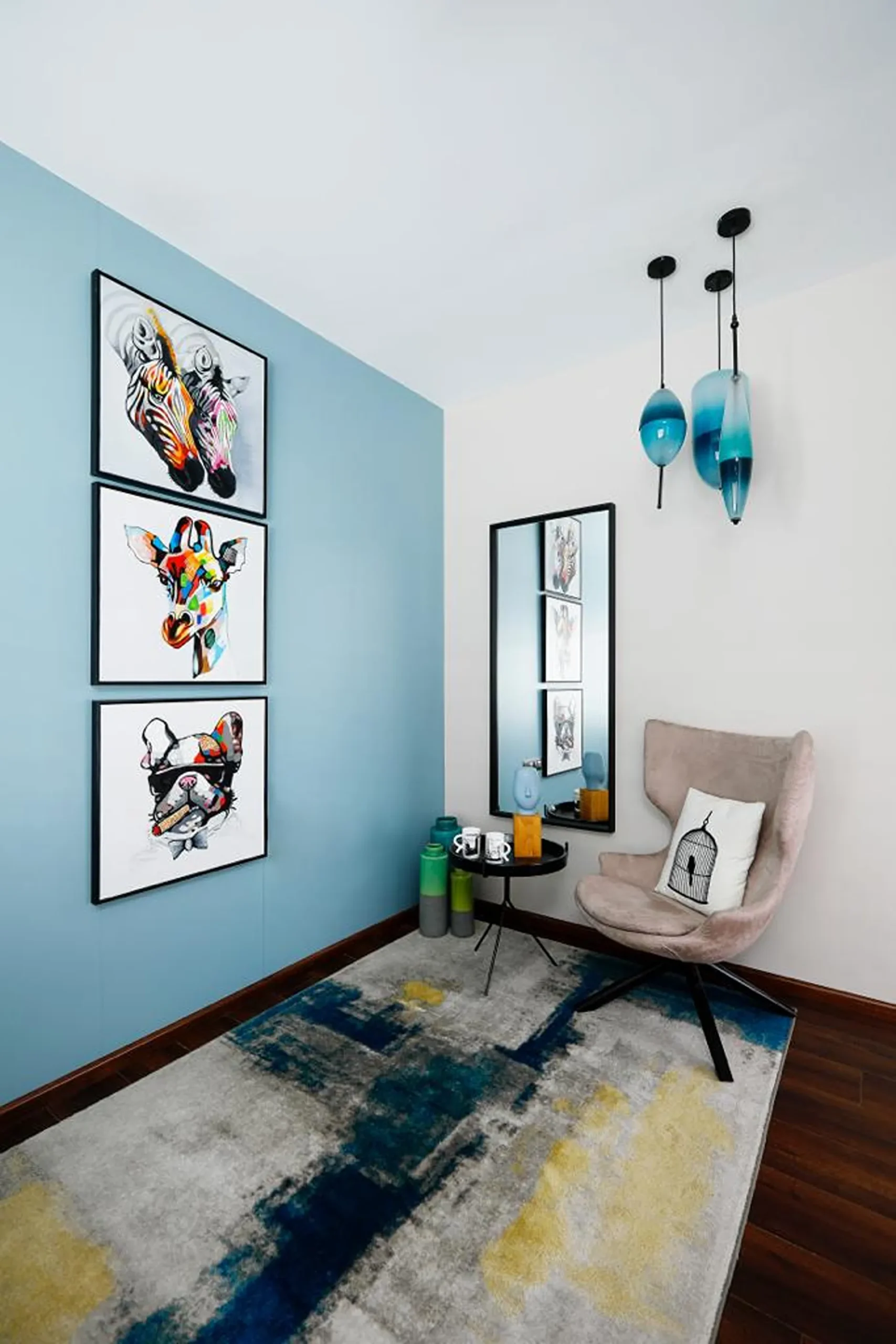 Light becomes a key character in the home—dramatic ceiling domes in the living room, musical fluted suspensions over the dining area, clusters of hanging pendants in the den, blue accents in the kids’ room, and a whimsical metal-frame light with a bird motif in the guest room all add character and charm. Vibrant art complements the interiors, enhancing the sense of joy and energy, while every piece of furniture, lighting, and styling element—sourced from China—is selected for its creativity, comfort, and cohesion.