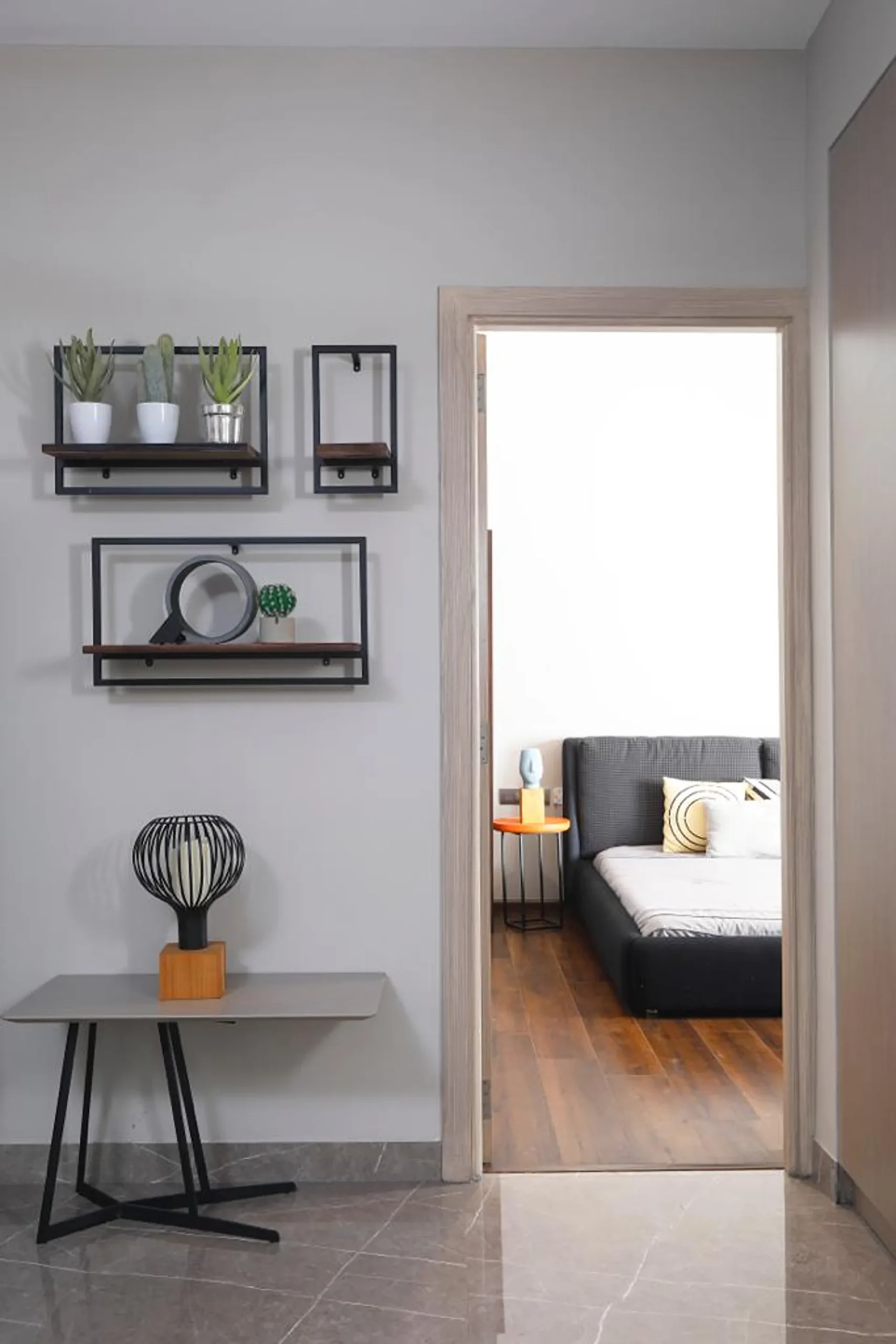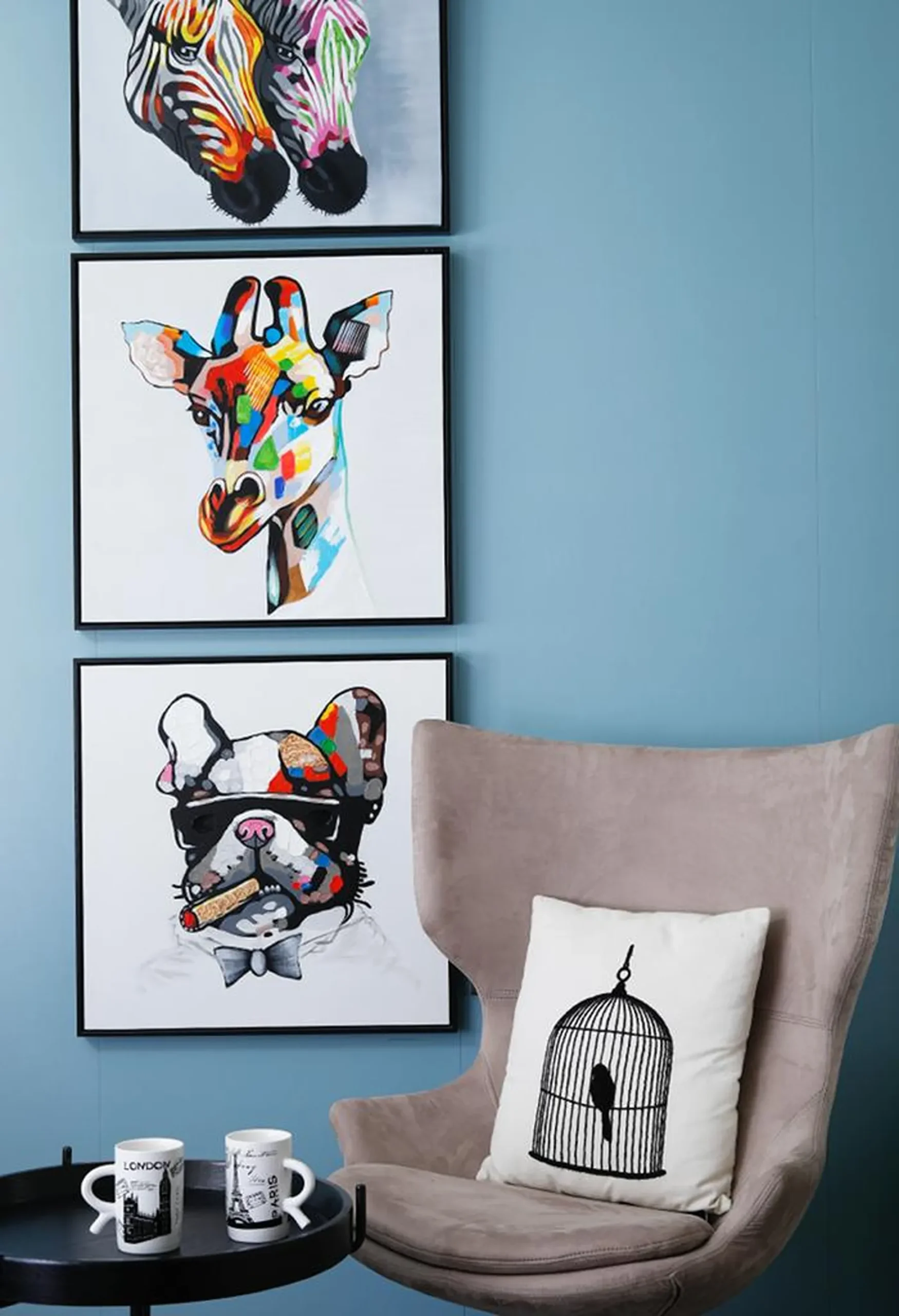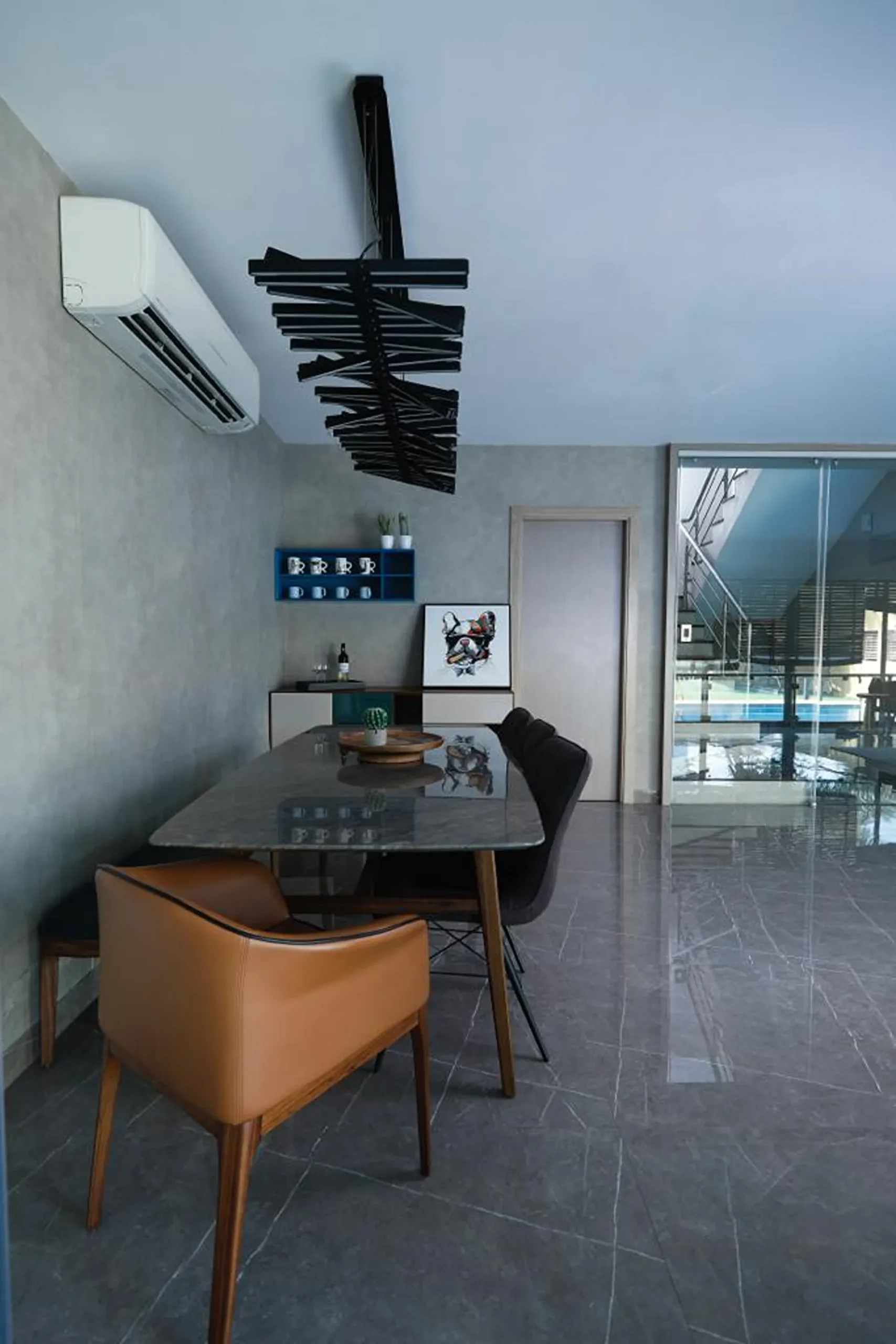 Light becomes a key character in the home—dramatic ceiling domes in the living room, musical fluted suspensions over the dining area, clusters of hanging pendants in the den, blue accents in the kids’ room, and a whimsical metal-frame light with a bird motif in the guest room all add character and charm. Vibrant art complements the interiors, enhancing the sense of joy and energy, while every piece of furniture, lighting, and styling element—sourced from China—is selected for its creativity, comfort, and cohesion.