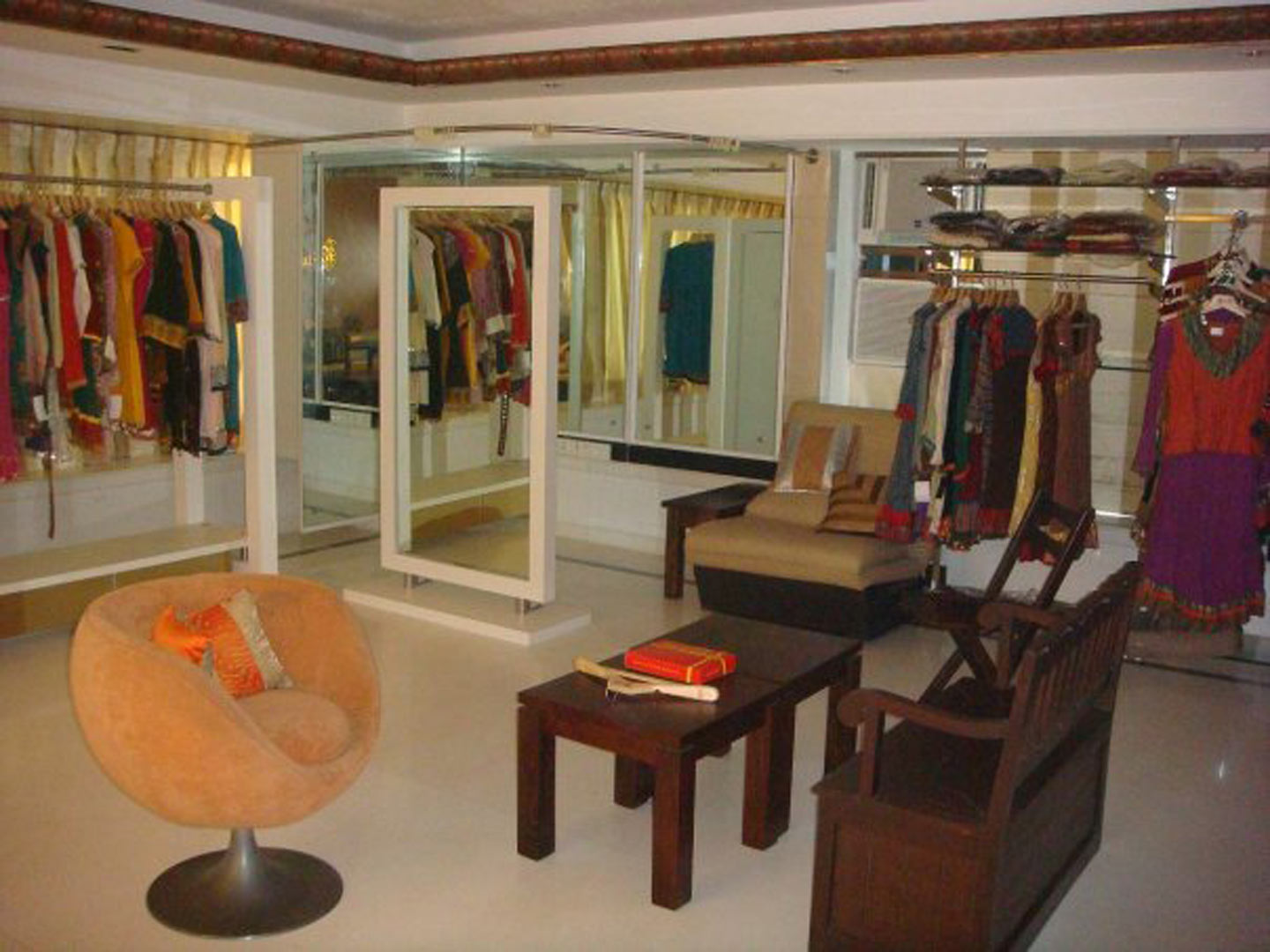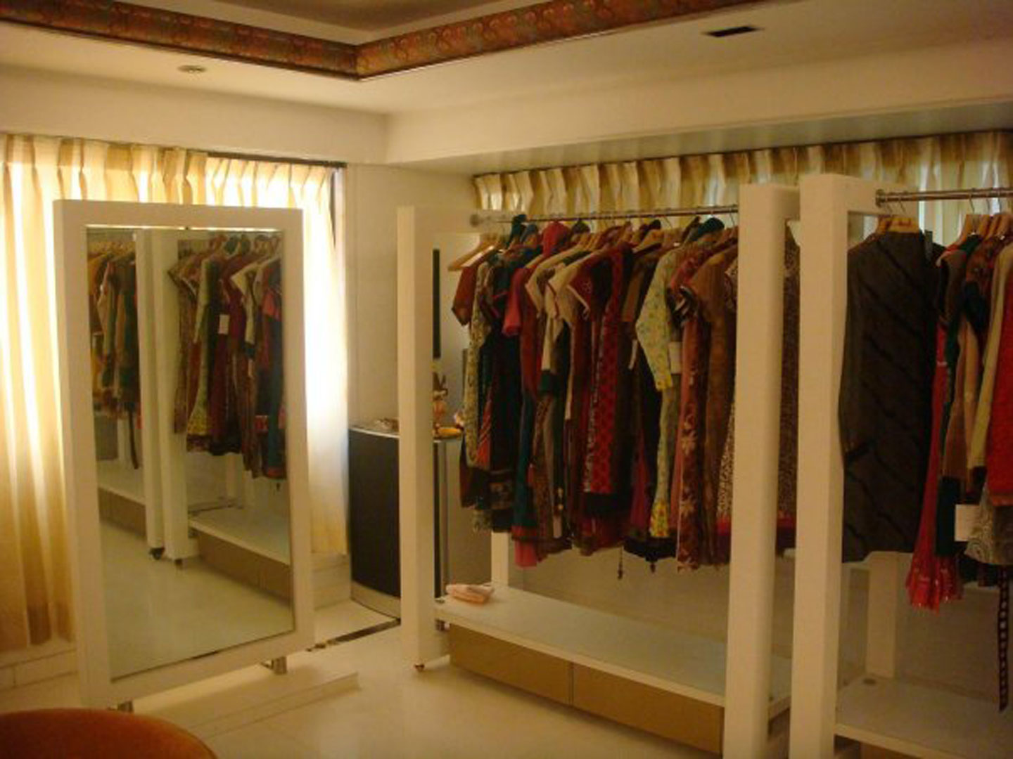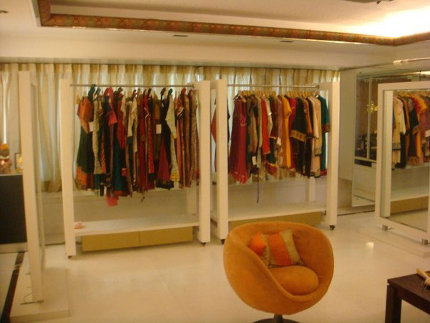 Everything in the room was embellished with rich materials like raw silk. The soft brown hues are accentuated by the bold gold elements giving it a very 1900’s look what with the Victorian style antique railway clock. The bright colours of the fabric used for the false ceiling look simply majestic and add vibrancy to the room. The specially designed clothes racks and the revolving mirror give a very upscale look to the boutique.